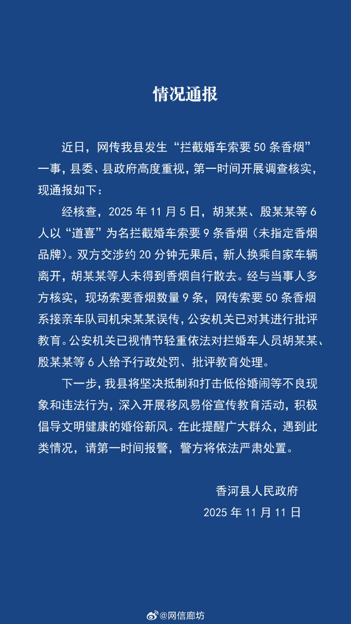 柳荷投资 婚车遭拦截索要50条烟?河北廊坊通报:实为9条,6人被处理